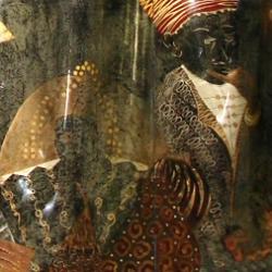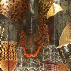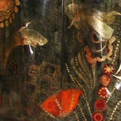 10m2 de laque sur le thème de "l’assemblée des femmes d’Aristophane" : composition puissante en 3 parties ; les panneaux verticaux ont 2m60 de haut et la partie médiane développe 7 mètres d’ondulations douces.
