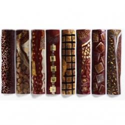 Ensemble de 8 bannières aux couleurs inattendues (violet de manganèse mêlé d’argent) déclinant le thème du col des vêtements chinois.