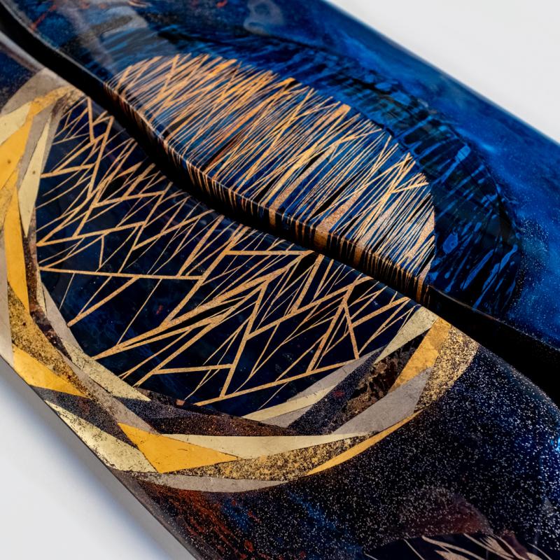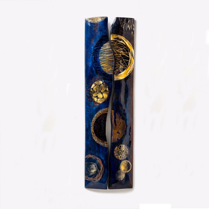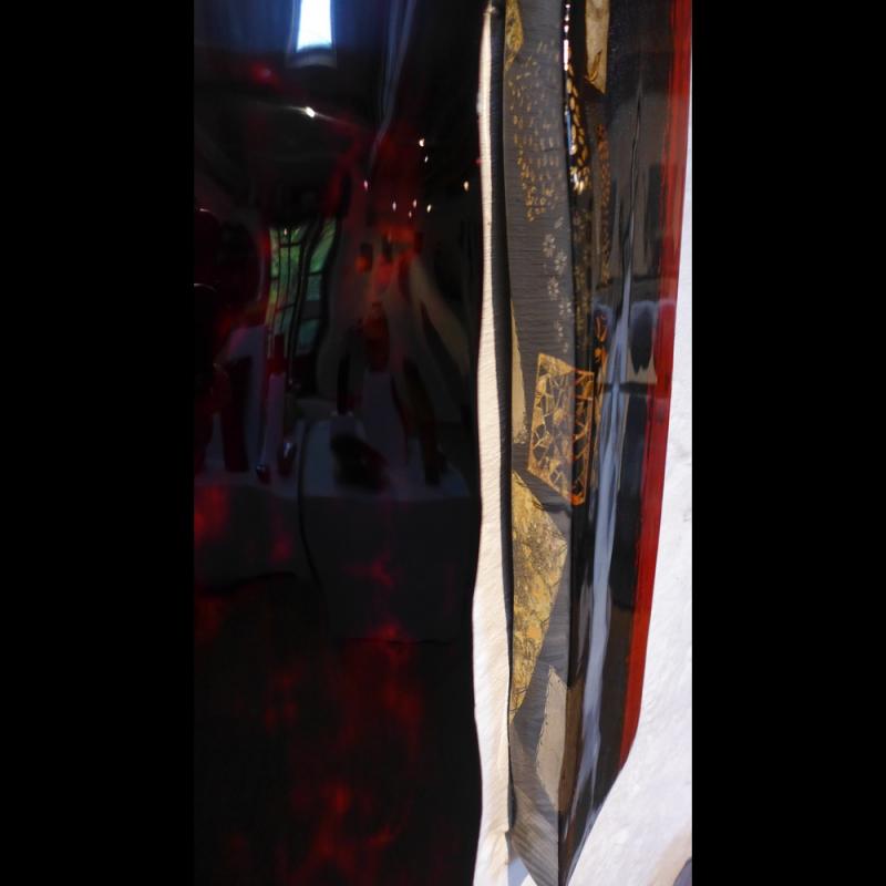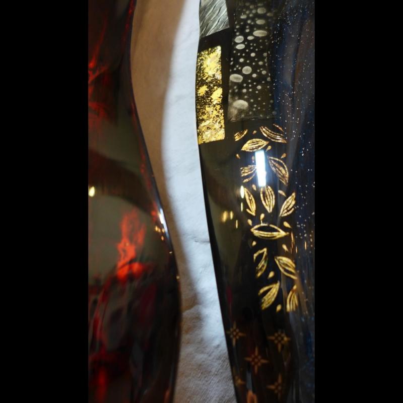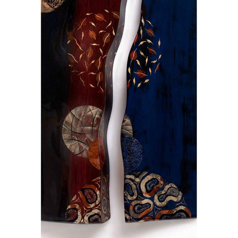 Série de diptyques ondulants dont la forte épaisseur est entièrement ornée de décors,surface suscitant l’envie de caresser la peau de la laque.