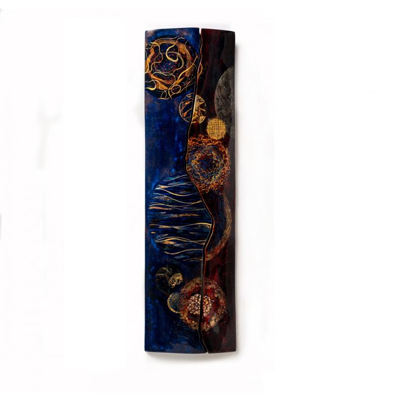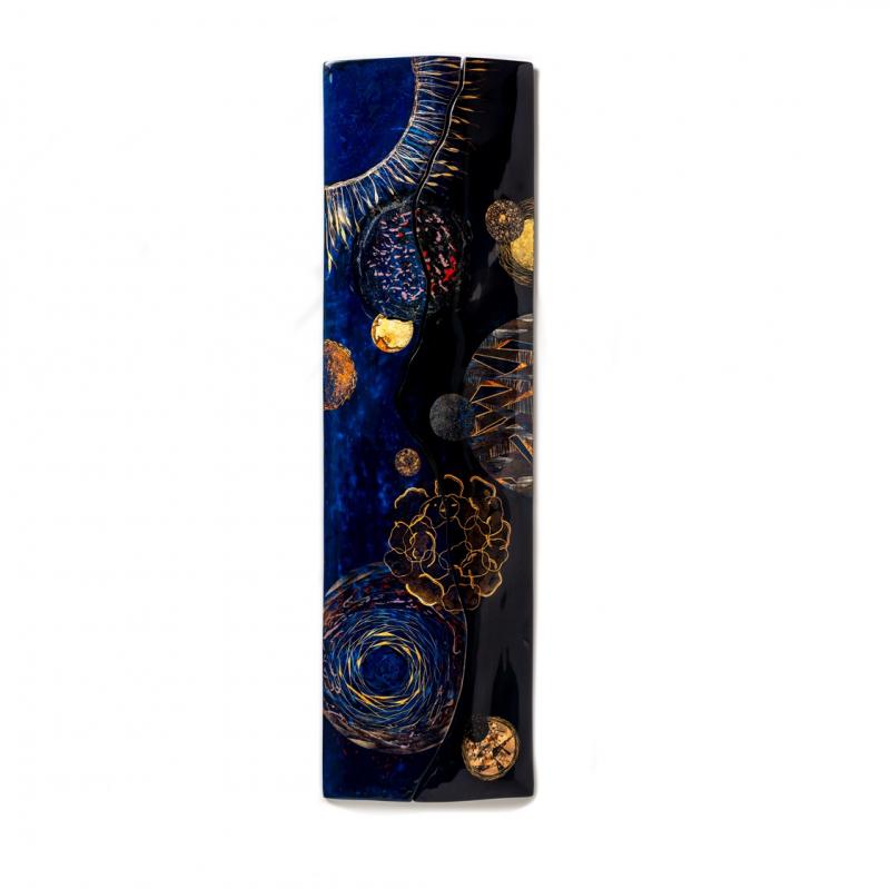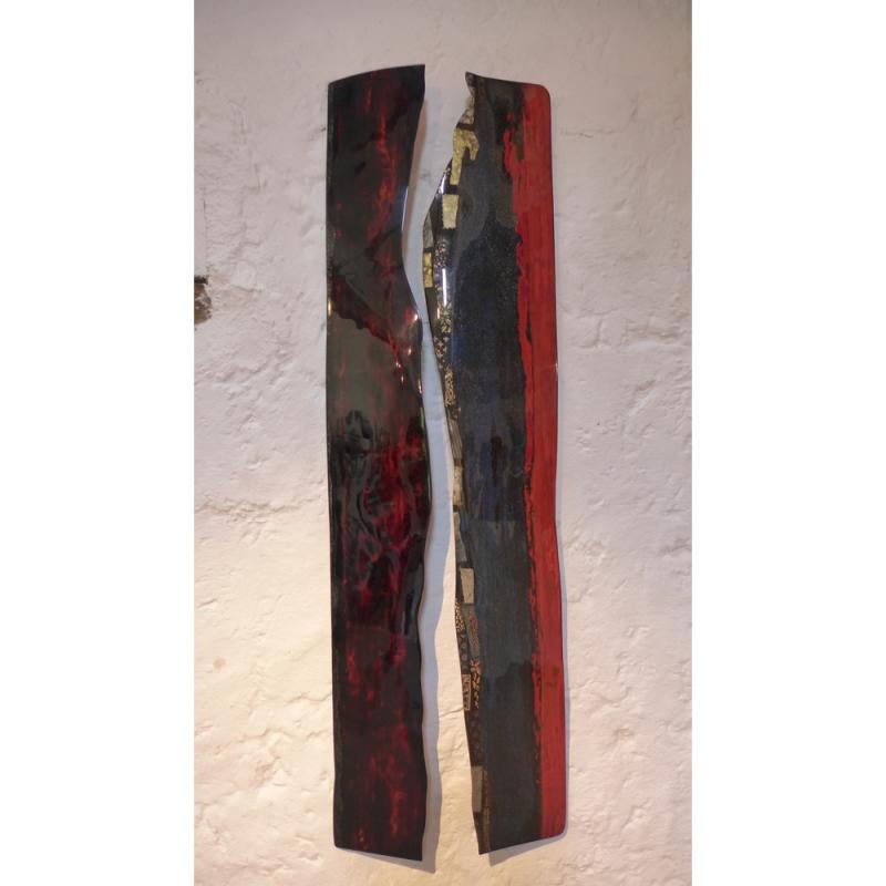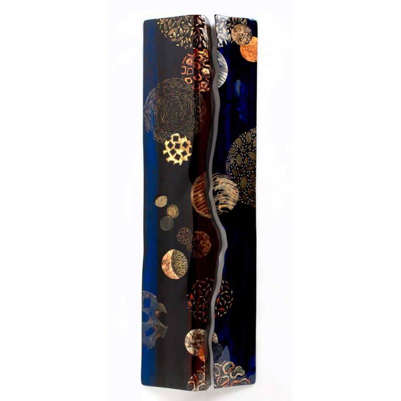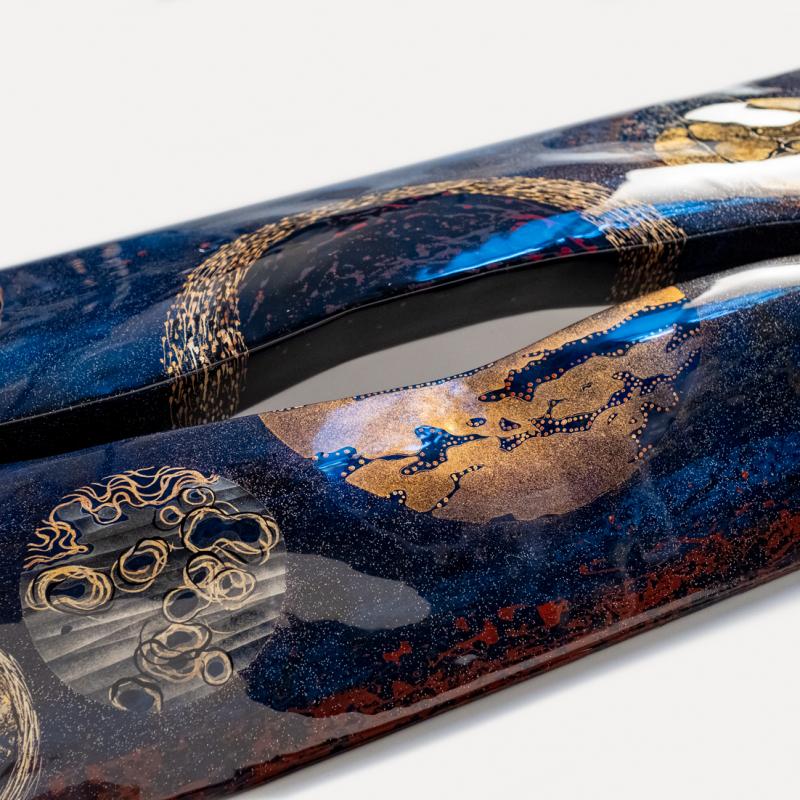 Série de diptyques ondulants dont la forte épaisseur est entièrement ornée de décors,surface suscitant l’envie de caresser la peau de la laque.