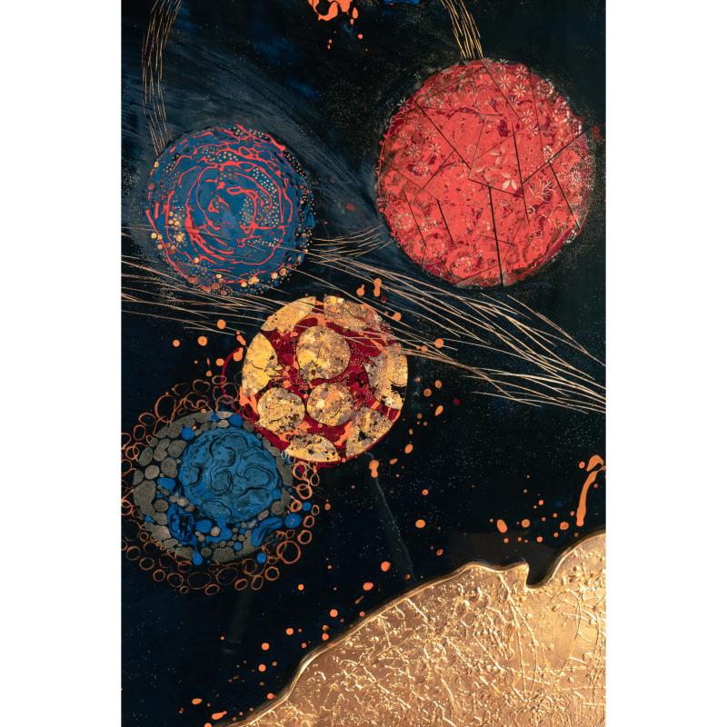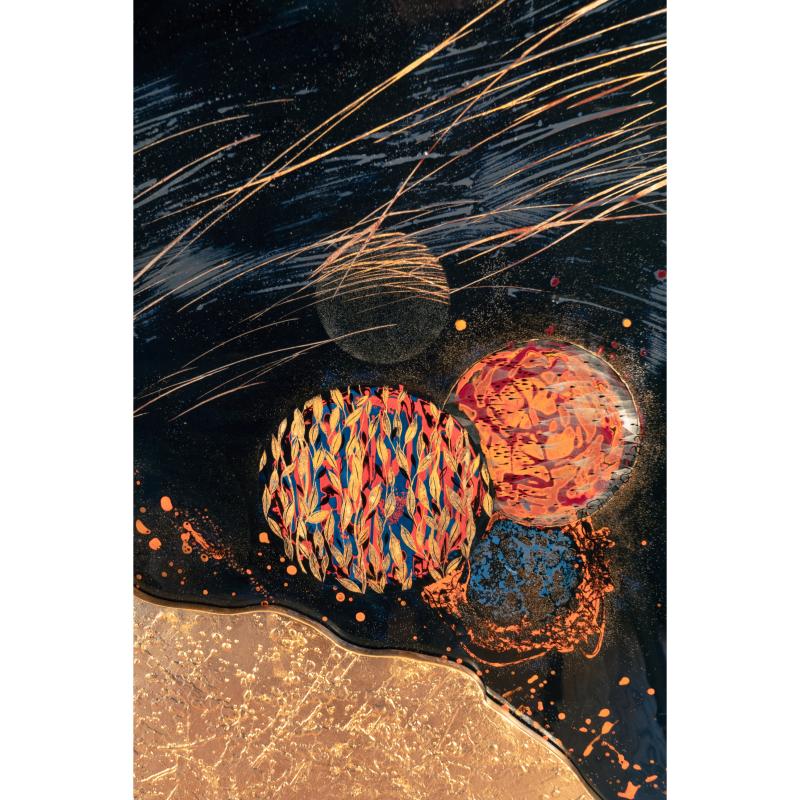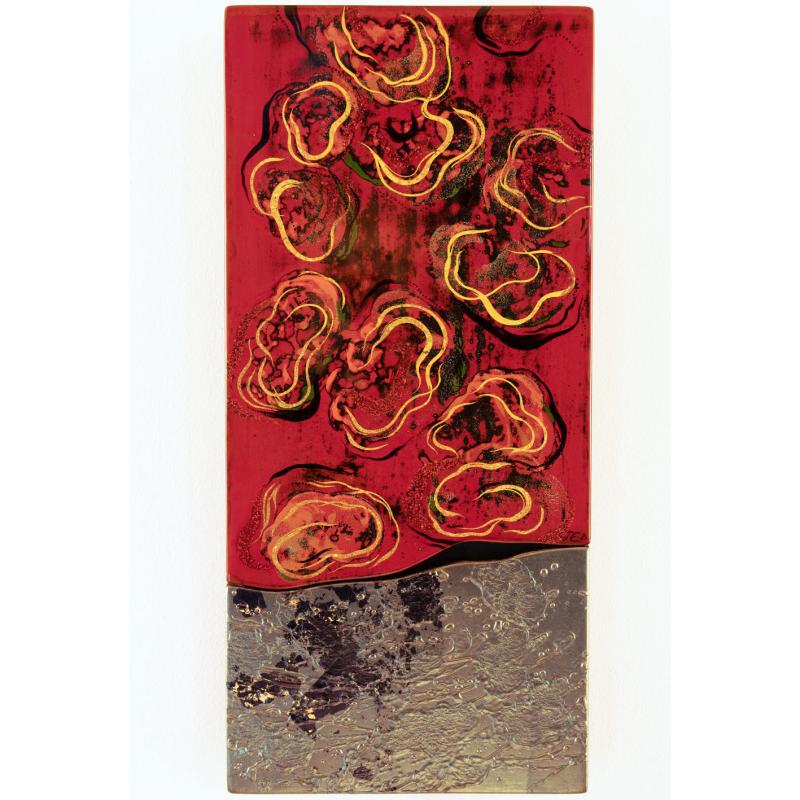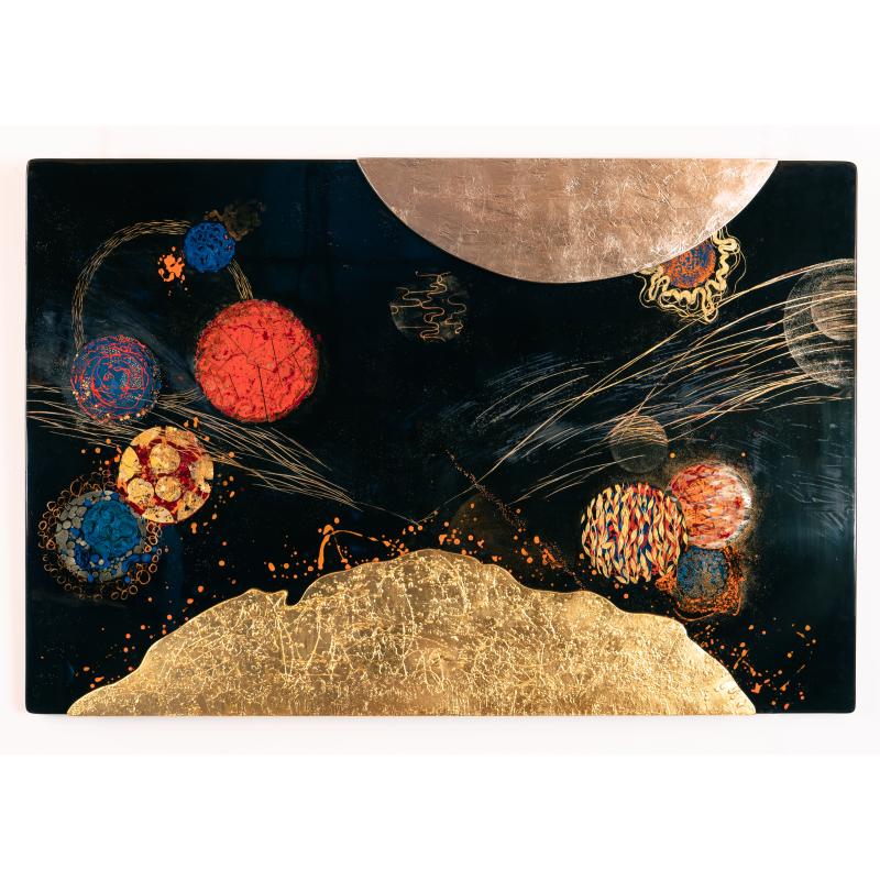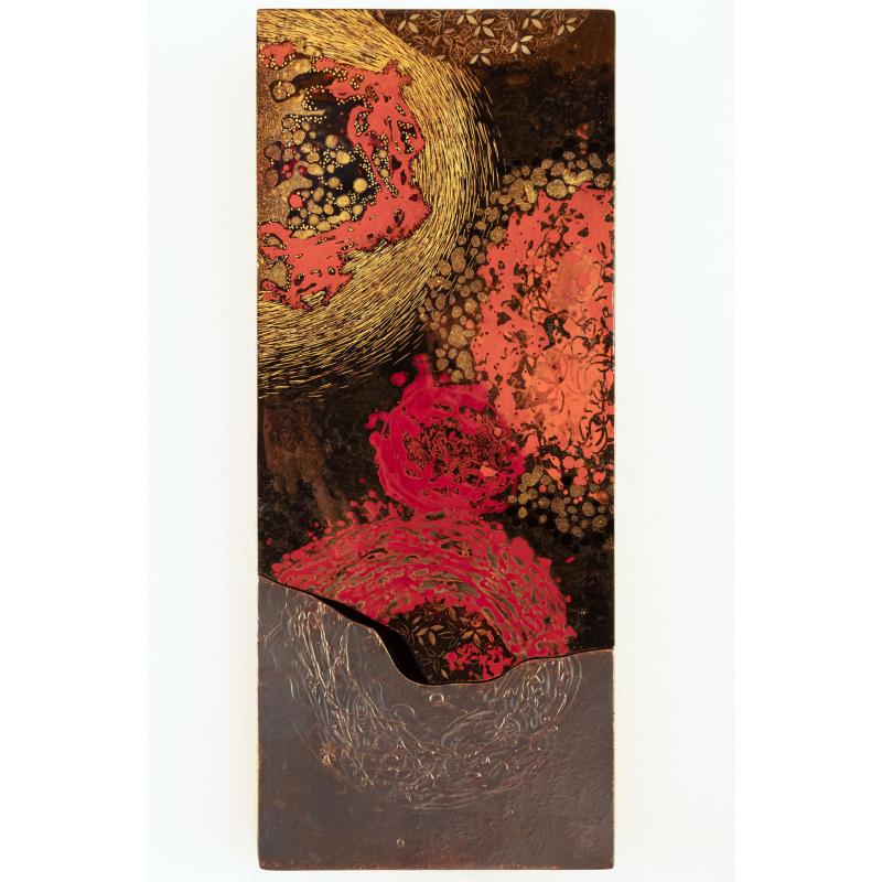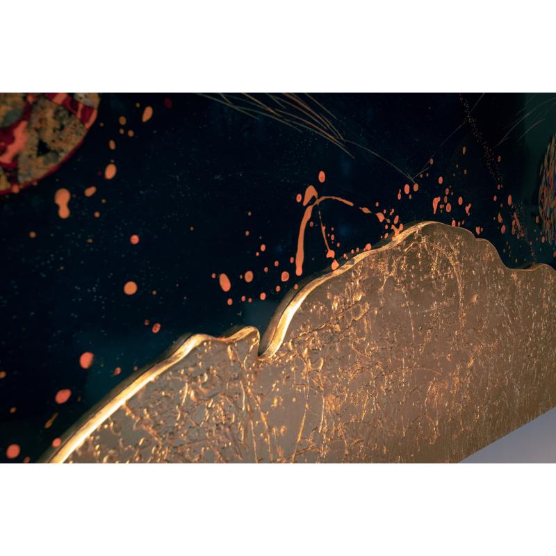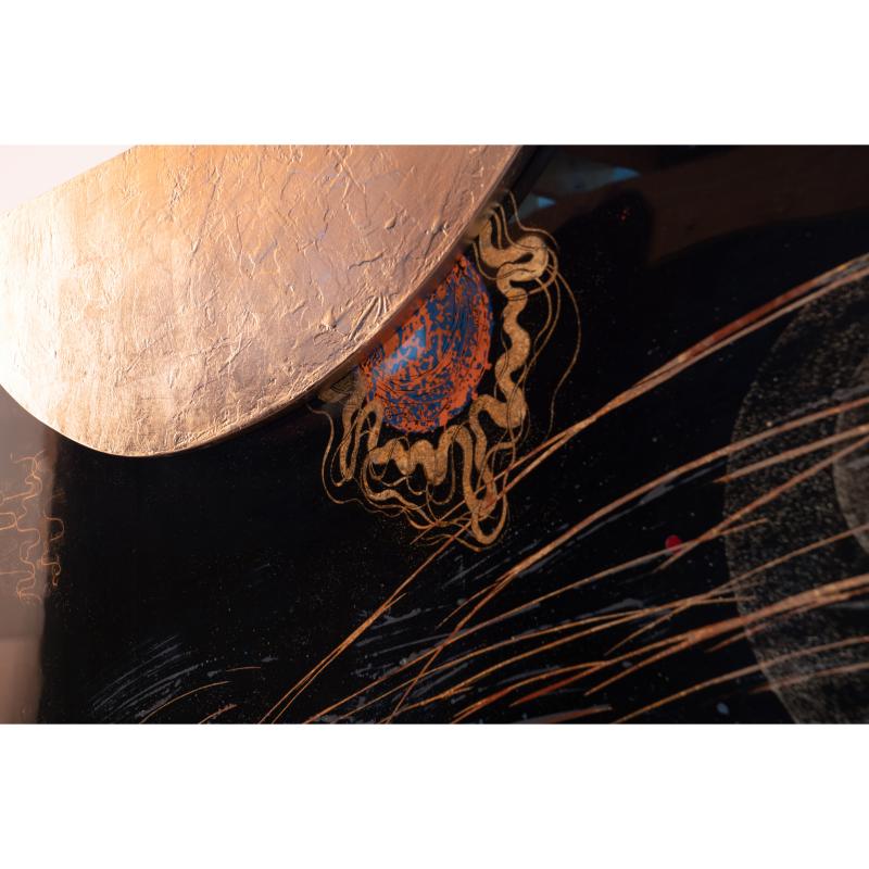 Opposer à la matière brillante et profonde de la laque les tourments de la texture de l’apprêt au blanc de Meudon ennobli des ors les plus précieux.